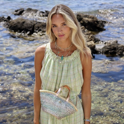 Natural palm mini basket, lined with glitter fabric, metallic leather handles and chain handle.