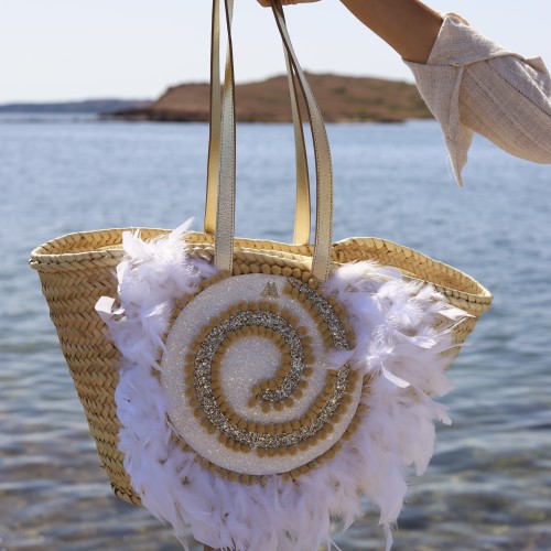 Basket made of natural palm, white and golden glitter, with white feathers in the shape of a seashell. Designed by Cris Mata.