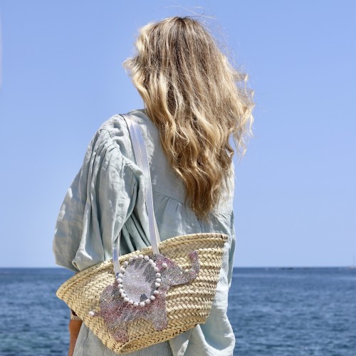 Basket made of natural palm, lined with elephant-shaped glitter fabric, and metallic leather handles. Designed by Cris Mata.