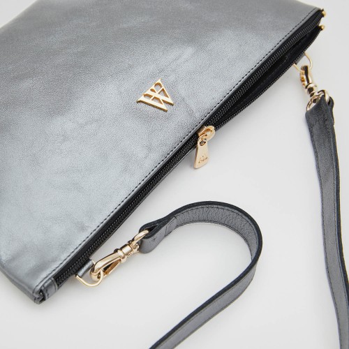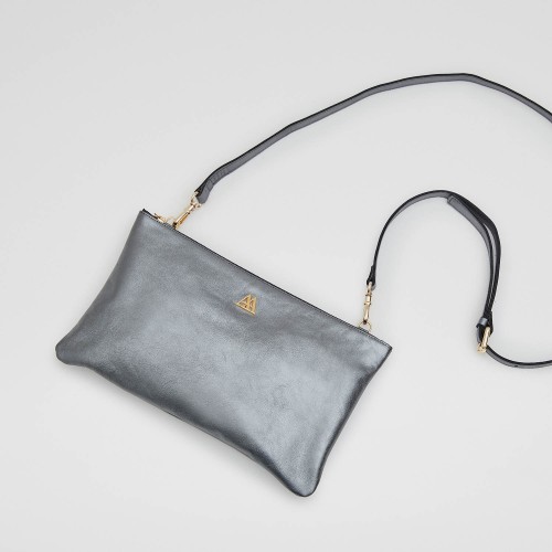Clutch bag made in steel coloured metallic leather. Two possible combinations, long handle and short handle.