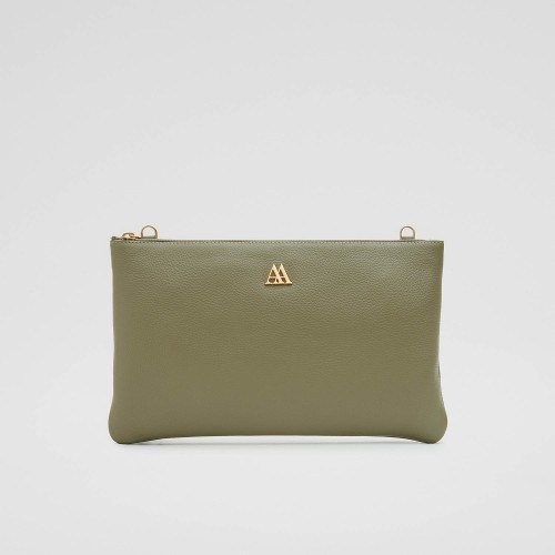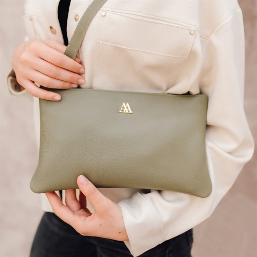 Clutch style bag made in khaki green leather.