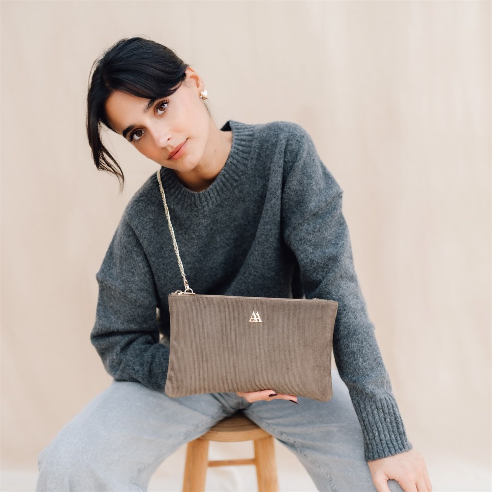 3. Clutch bag made of recycled taupe corduroy fabric.