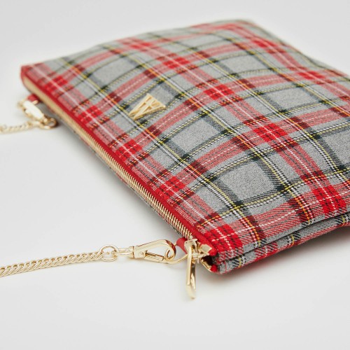 Clutch style bag with base made of high quality plaid fabric.