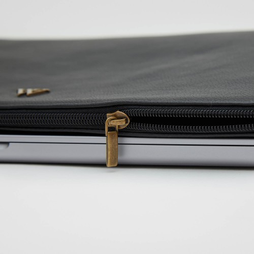 Padded device case, made in black grained leather.
