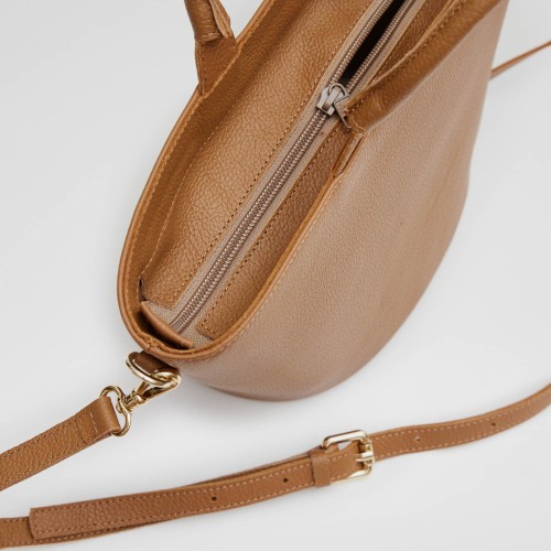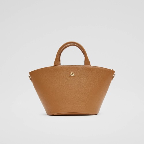 Bag in the shape of a basket made in brown leather.