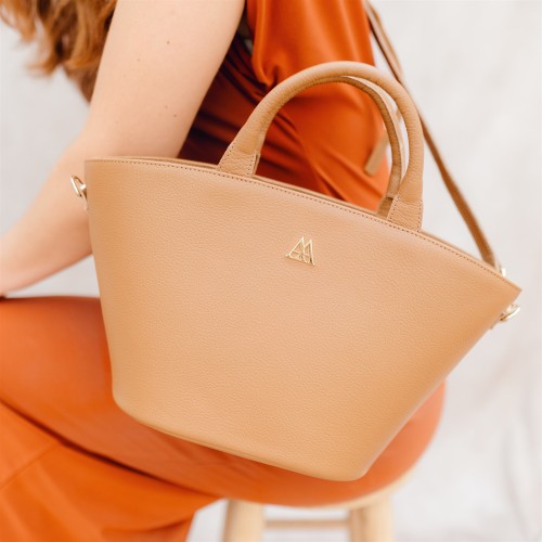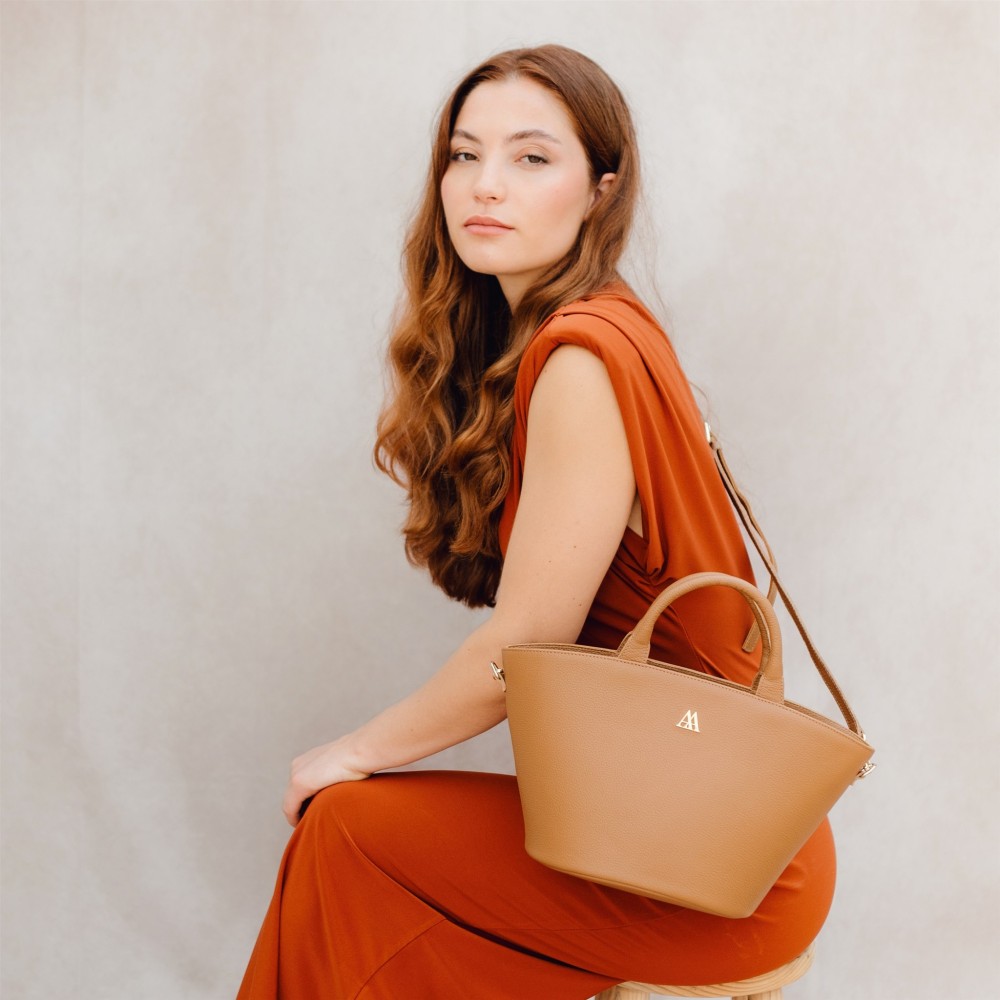Bag in the shape of a basket made of high quality brown leather.