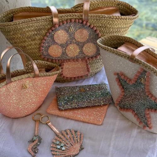 Charm made of glitter fabric in the shape of a seahorse, designed by Cris Mata.