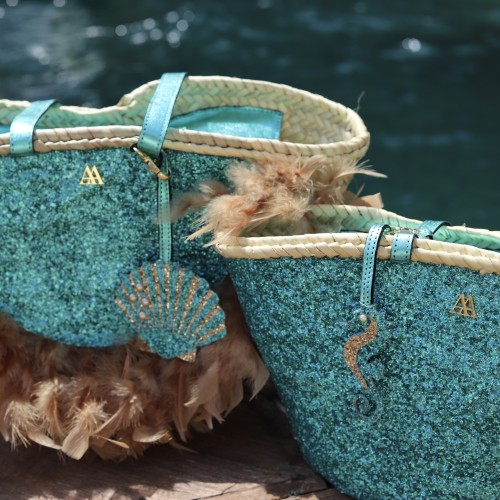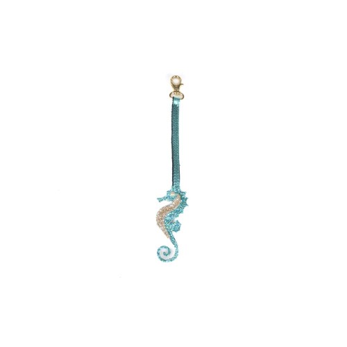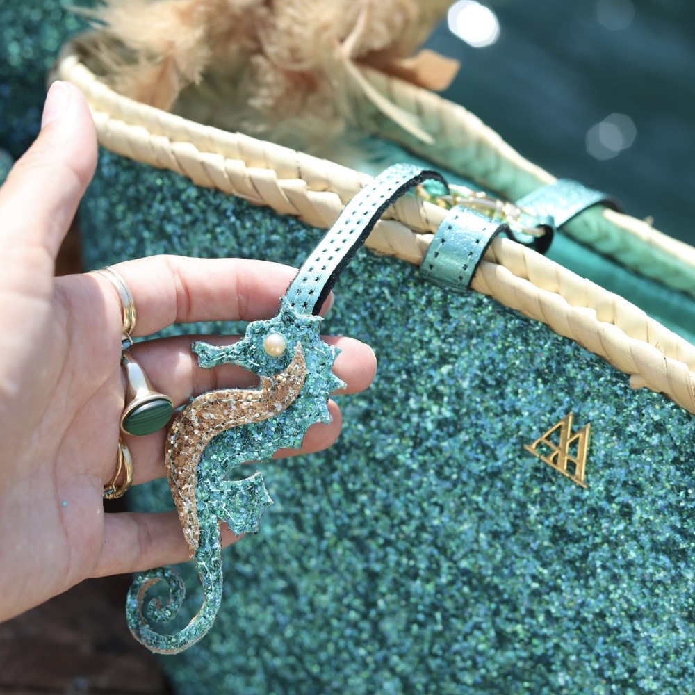 Charm made of glitter fabric in the shape of a seahorse, designed by Cris Mata.