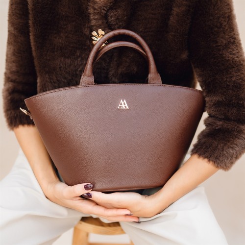 Bag in the shape of a basket made of high quality dark brown leather.