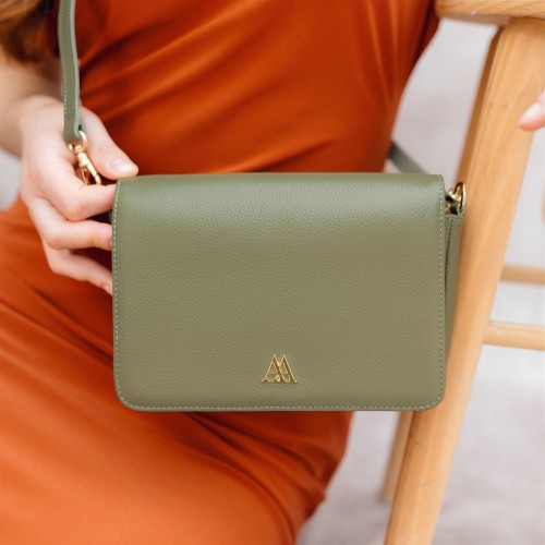 Handbag with flap made in high quality green leather.