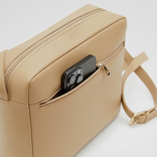 Berta bag, shoulder bag, square format, made in beige engraved leather.