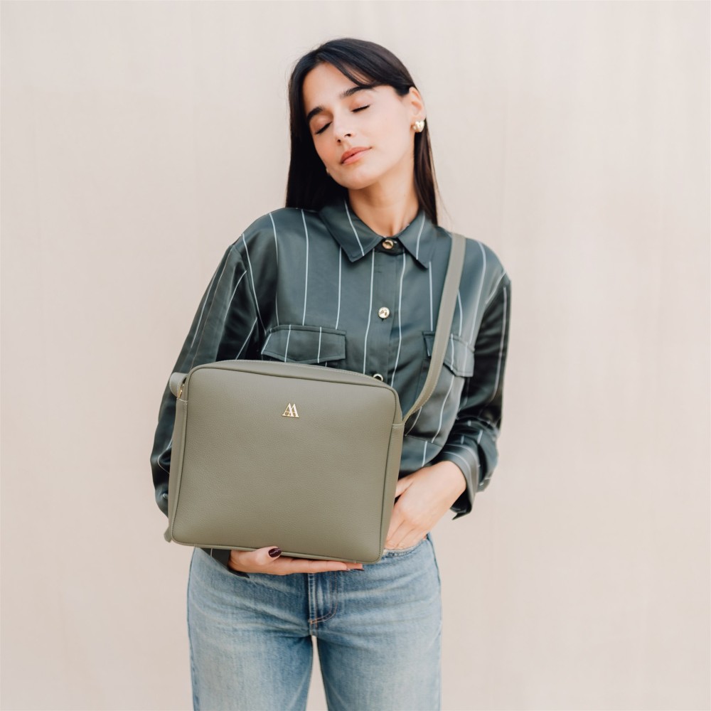 Berta bag, shoulder bag, square format, made in green khaky engraved leather