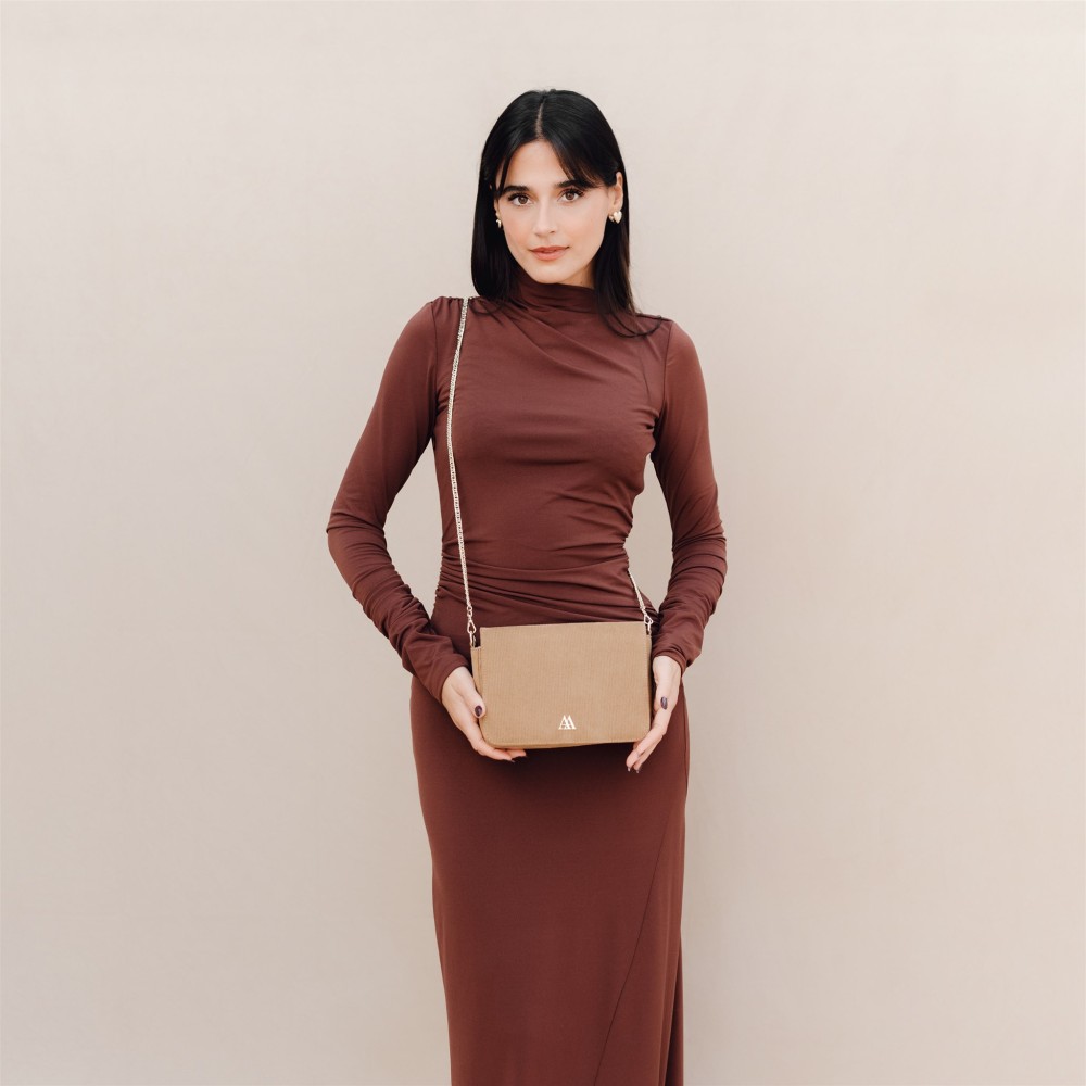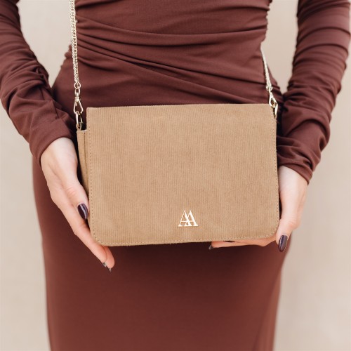Clutch bag made of recycled brown corduroy fabric.