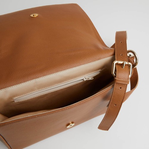 Bolso con solapa fabricado en piel gravada de alta calidad en color cuero.