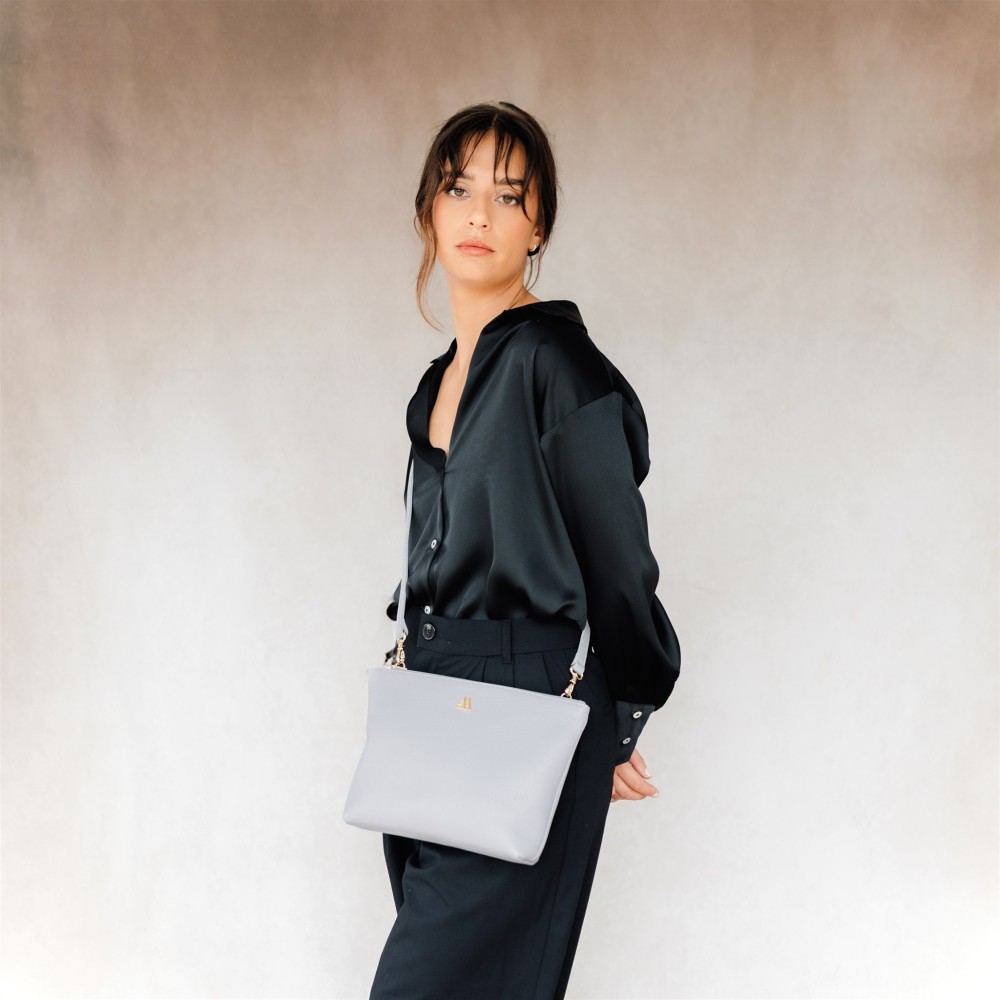 Bolso clutch fabricado en piel rugosa de alta calidad en color gris.