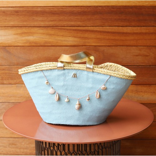 Capazo de palma natural, forrado con tejido celeste, adornado con conchas, con asas de piel metalizada.