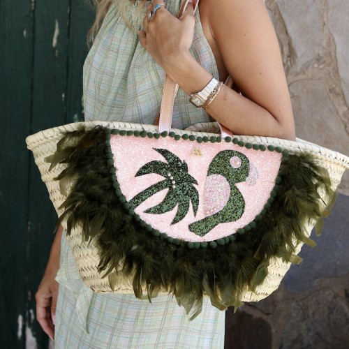 Capazo de palma natural, glitter salmón y verde kaki, con plumas verdes con motivos tropicales. Diseñado por Cris Mata.
