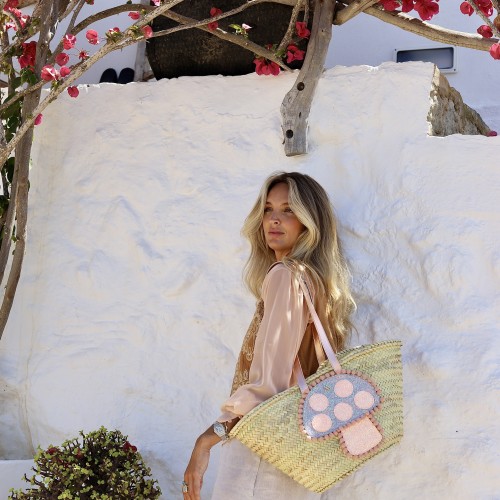 Capazo de palma natural, glitter salmón y malva, con madroños rosas, formando una seta. Diseñado por Cris Mata.