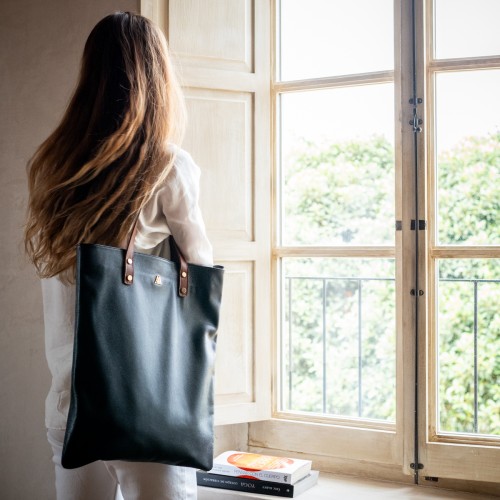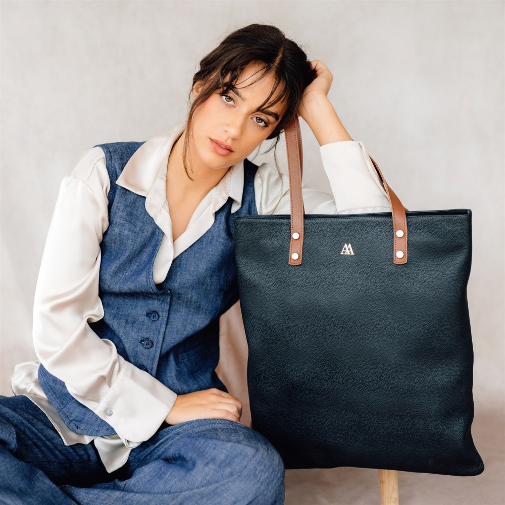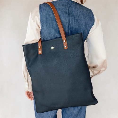 Bolso tote bag fabricado en piel color azul marino.