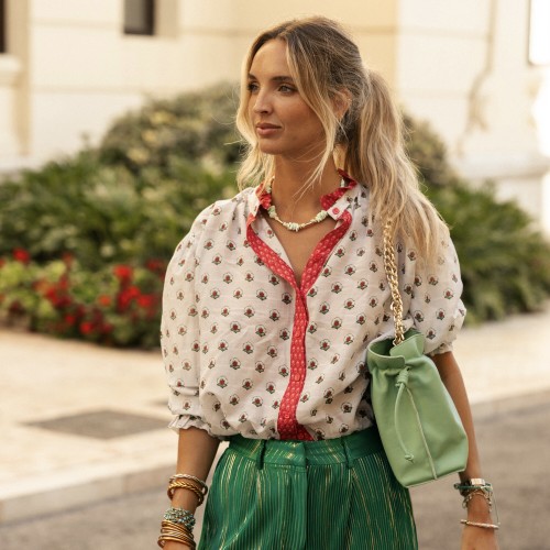 Cierre mediante imán dorado y cordón que frunce el bolso.