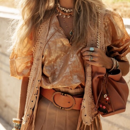 Cierre mediante imán dorado y cordón que frunce el bolso.