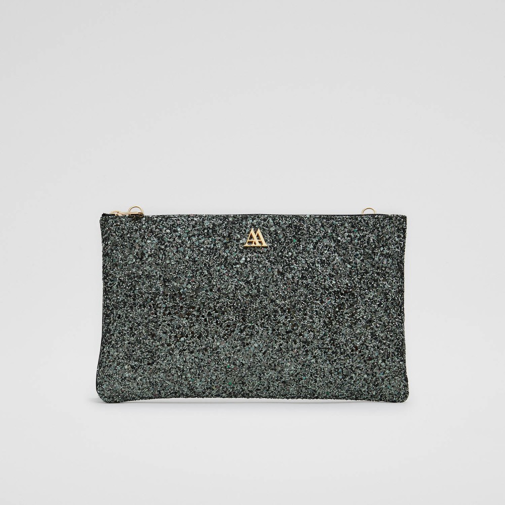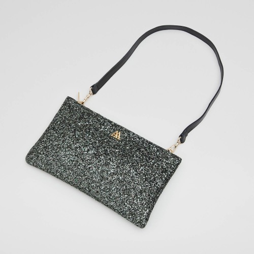 Bolso estilo clutch fabricado en su parte frontal con glitter gris antracita.