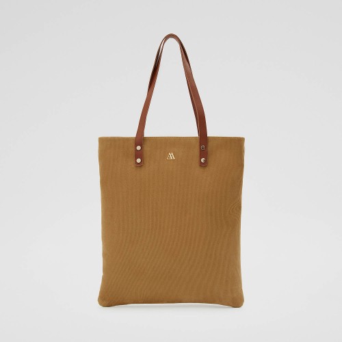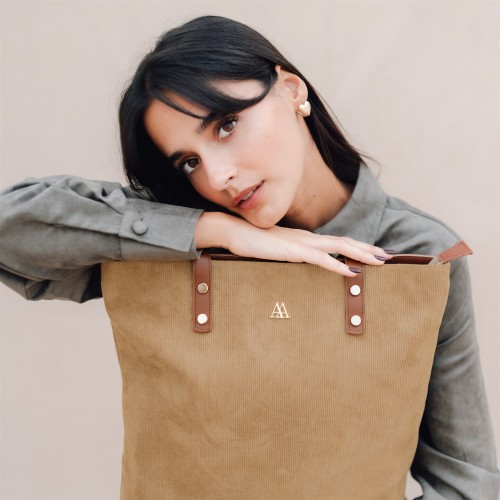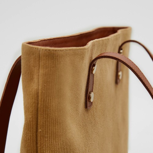 Bolso tote bag cerrado fabricado con tejido pana reciclada y piel.