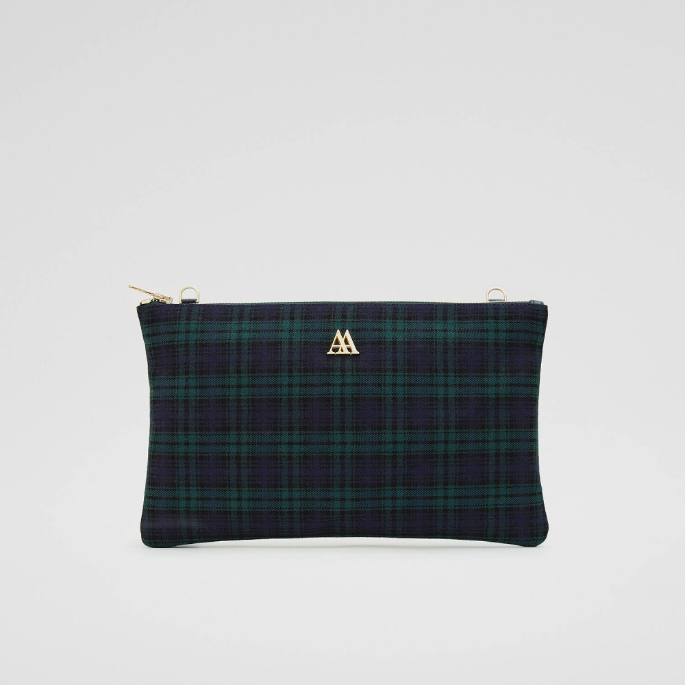 Bolso estilo clutch fabricado con tejido de cuadro escocés de alta calidad.