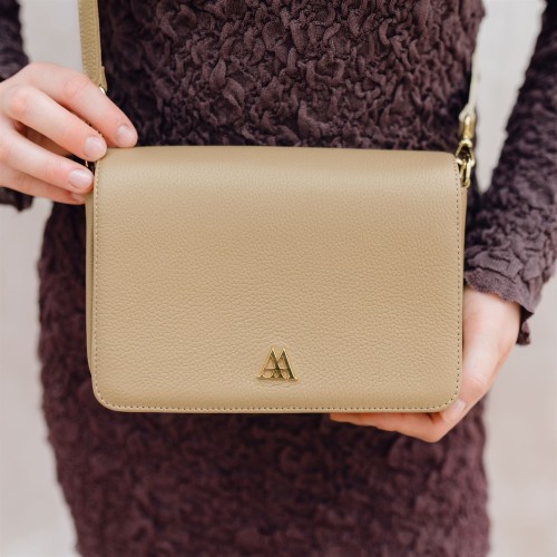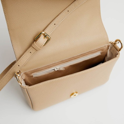 Bolso con solapa fabricado en piel beig de alta calidad.