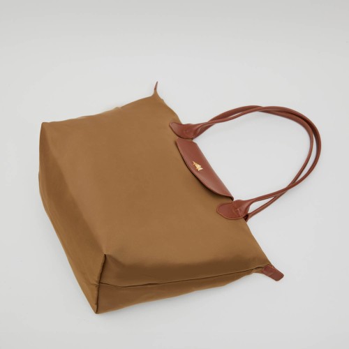 Bolso shopper plegable fabricado en en nylon marrón y piel marrón.