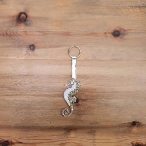 Charm fabricado en tejido glitter en forma de caballito de mar, diseñado por Cris Mata.