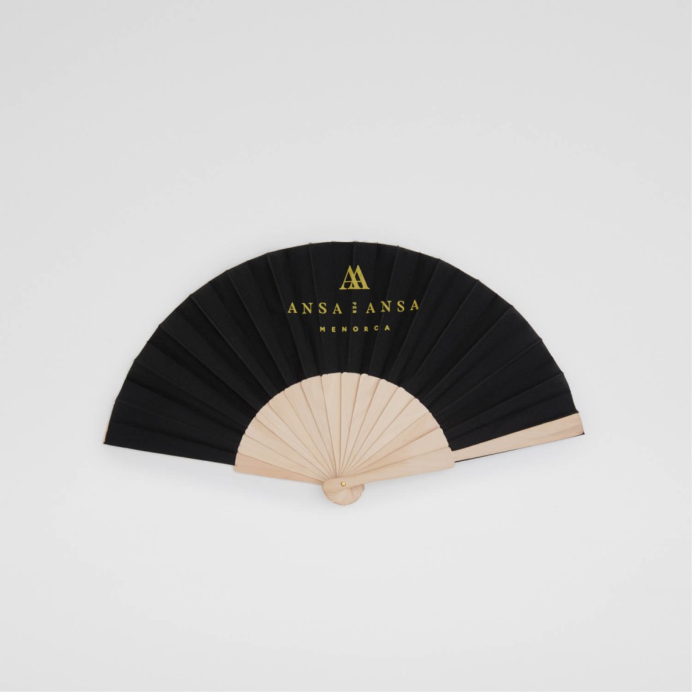 Abanico fabricado con madera natural, tejido negro, y texto dorado.
