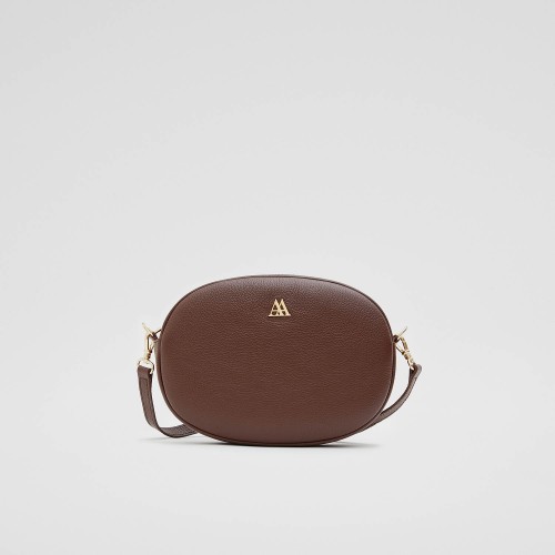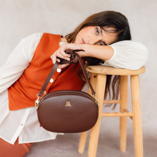 Bolso ovalado fabricado en piel de alta calidad en color marrón chocolate.