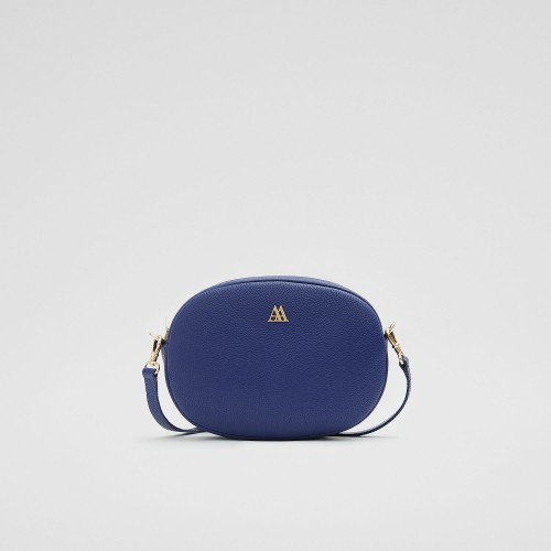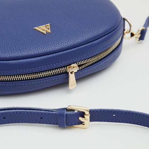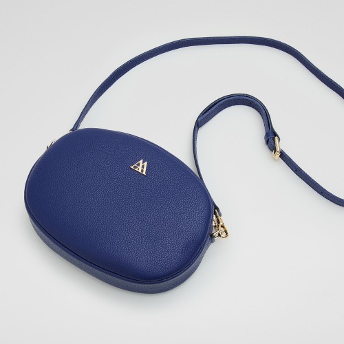 Bolso ovalado fabricado en piel de alta calidad en color azul.