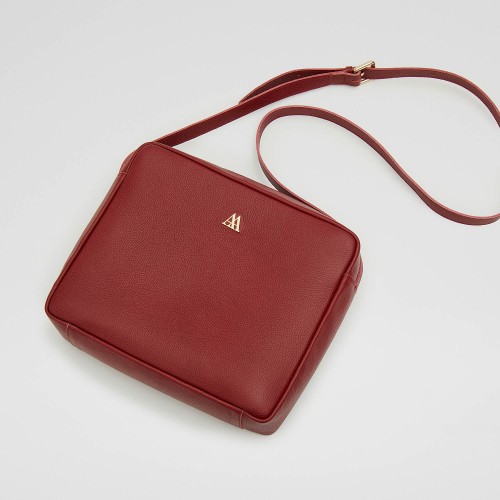 Bolso Berta, estilo bandolera, formato cuadrado, fabricado en piel grabada color burdeos.