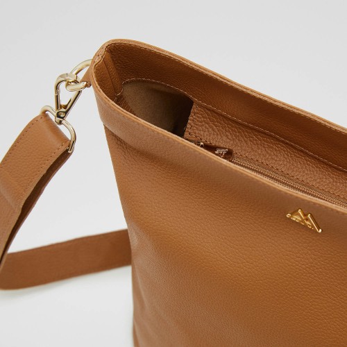 Bolso Berta, estilo bandolera, formato cuadrado, fabricado en piel grabada color cuero.