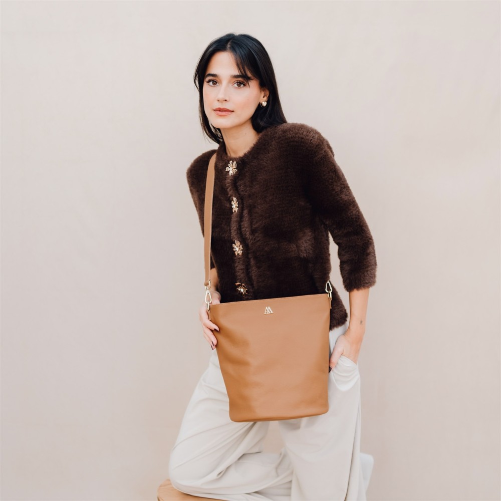 Bolso Selena, estilo saco, formato cilíndrico, fabricado en piel grabada color cuero.