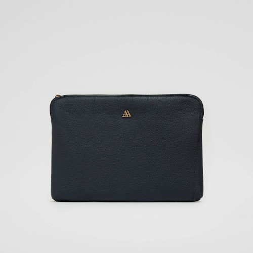Funda de dispositivo acolchada, fabricada en piel grabada azul marino.