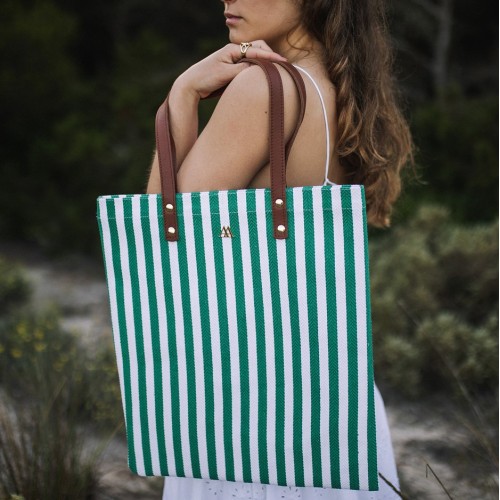Sac fourre-tout en tissu de coton et poignées en cuir.