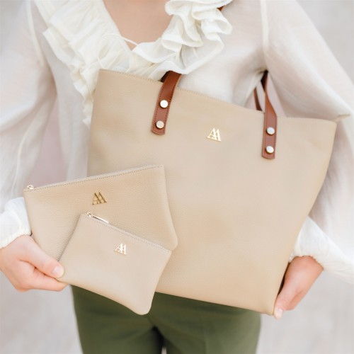 Pochette en cuir de haute qualité de couleur beige et de finition rugueuse.
