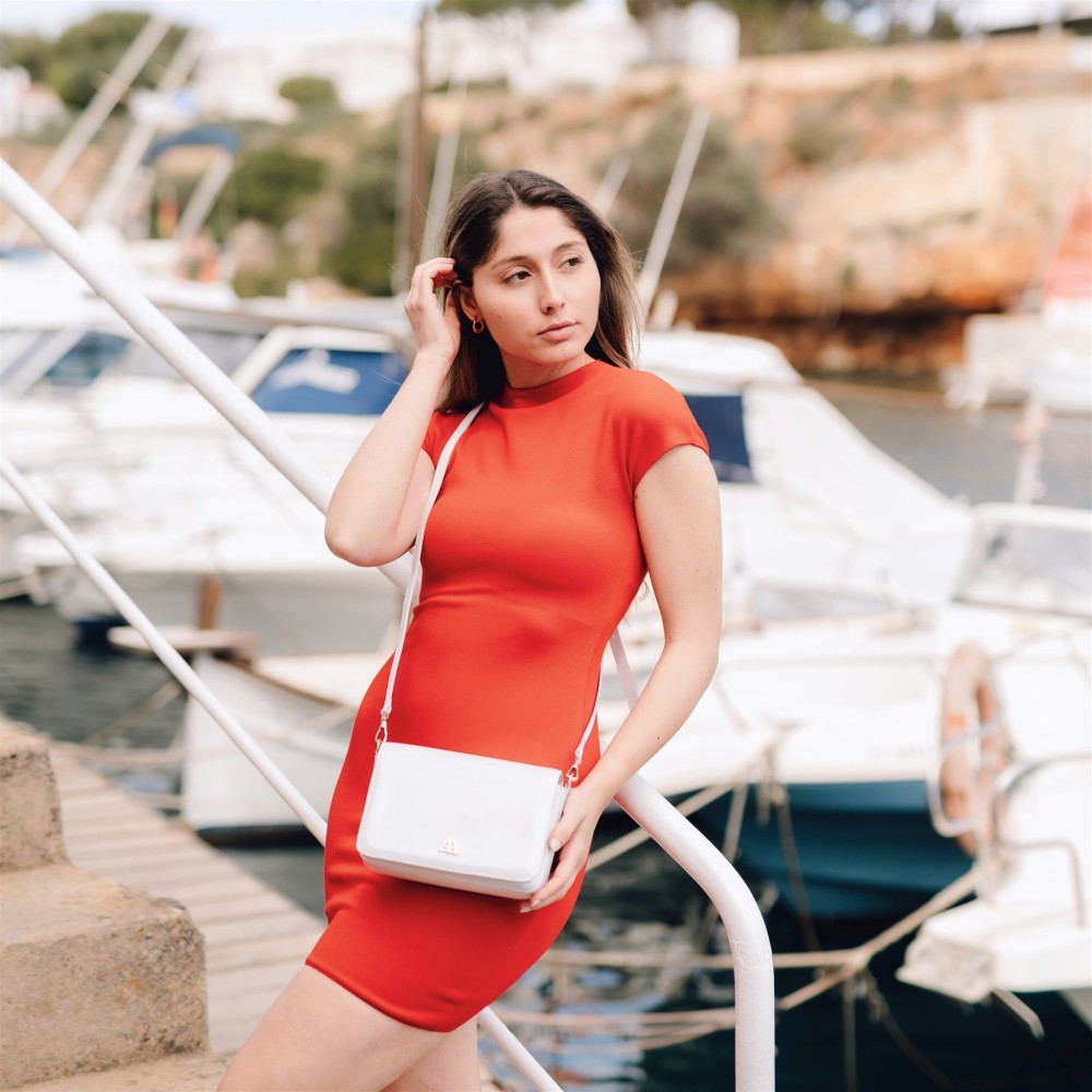 Sac à rabat en cuir verni laminé de haute qualité avec effet brillant, de couleur blanc.