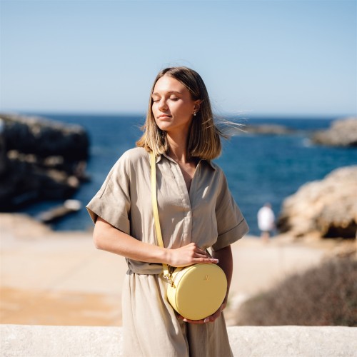 Sac à main rond en cuir de haute qualité de couleur jaune doux.