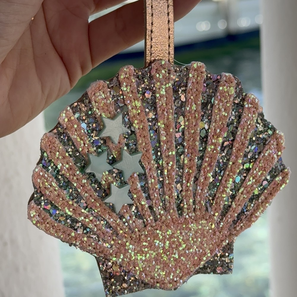 Breloque en tissu pailleté en forme de coquillage, créée par Cris Mata.
