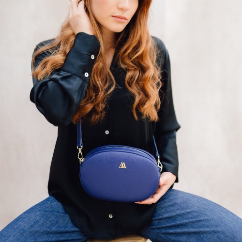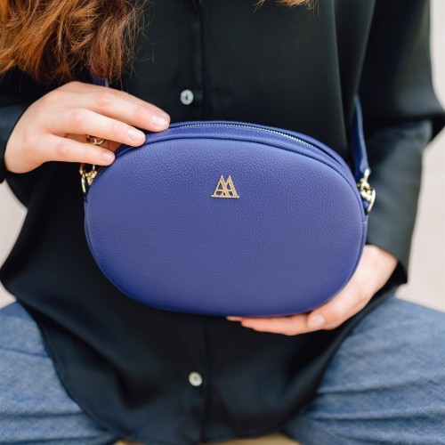 Sac à main ovale en cuir de haute qualité de couleur bleu.
