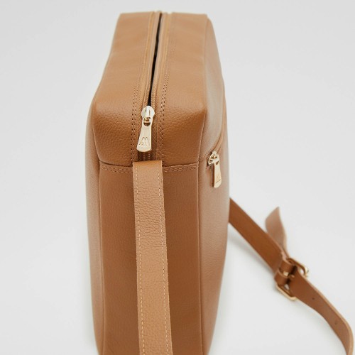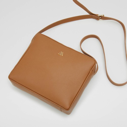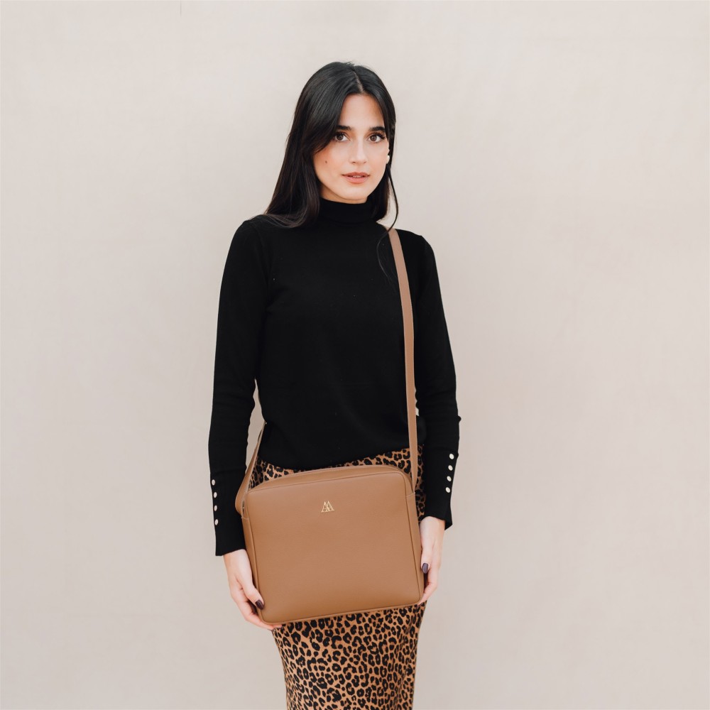 Sac Berta, style sac à bandoulière, format carré, en cuir gravé de couleur cuir.