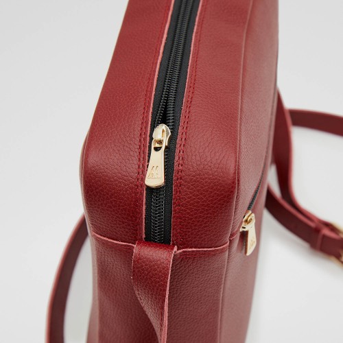 Sac Berta, sac à bandoulière, format carré, en cuir gravé bordeaux.
