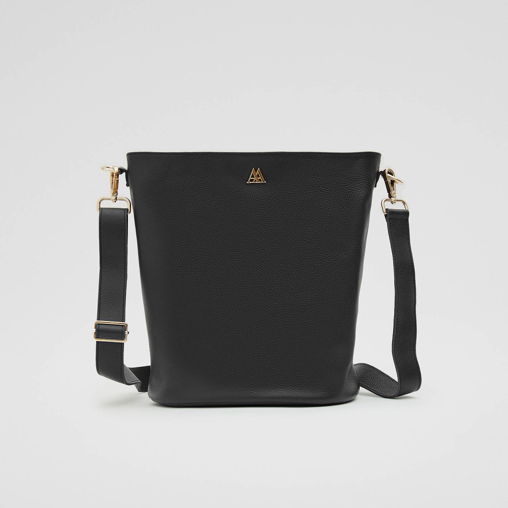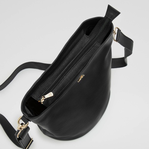 Sac à main Selena, de style sac, de forme cylindrique, en cuir gravé noir.