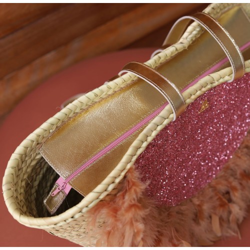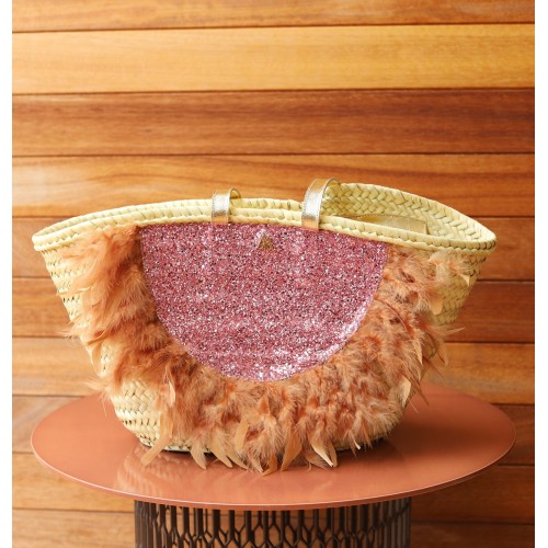 Panier en palmier naturel, doublé de tissu pailleté, orné de plumes naturelles et de poignées en cuir dorées métallisé.