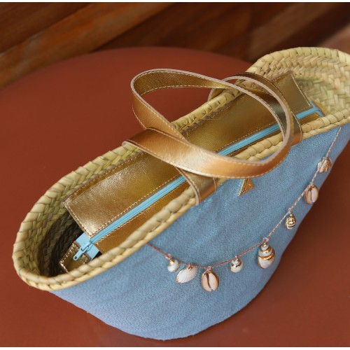 Panier en palmier naturel, doublé de tissu bleu clair, décoré de coquillages, avec poignées en cuir métallisé. Collection Cris Mata.
