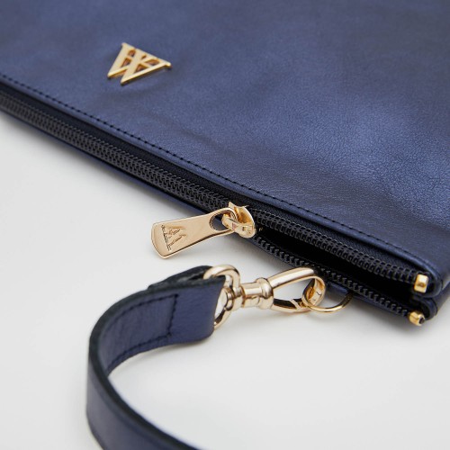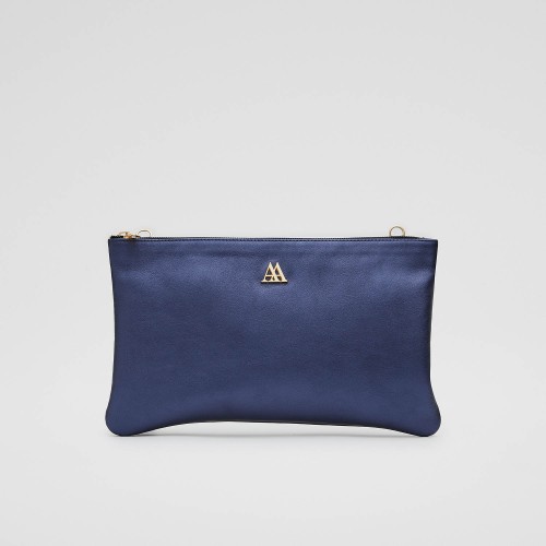 Pochette en cuir méallisé couleur bleu.